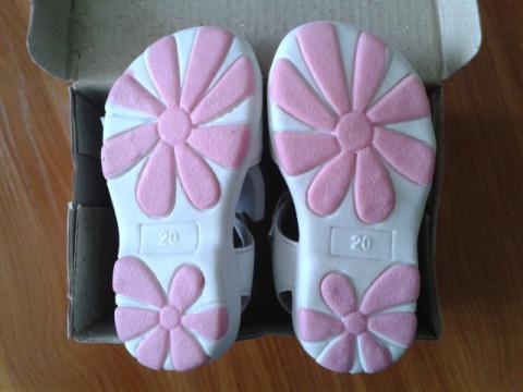 Fehér színű kisgyermek szandál tépőzáras pánttal. A szandál fejrészén 3 db színes, műanyag négyzet alakú díszítőelem található. A lábbeli műbőr felsőrésszel, műbőr béléssel, műanyag formatalppal és ragasztott technológiával készült. A lábbeli jelölt mérete: 20-as